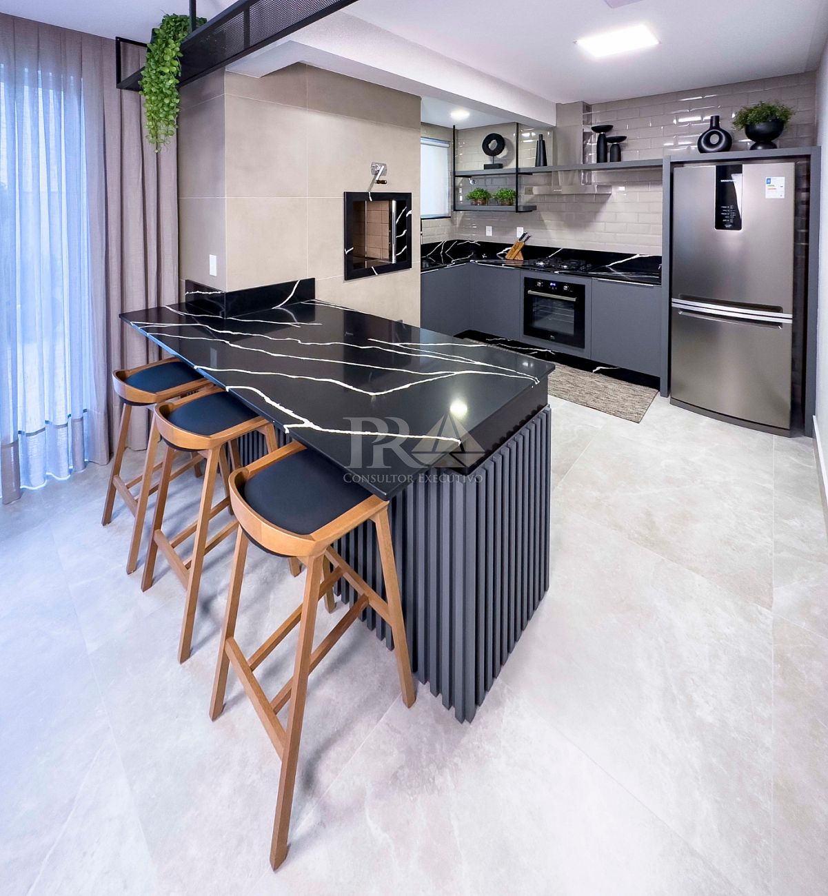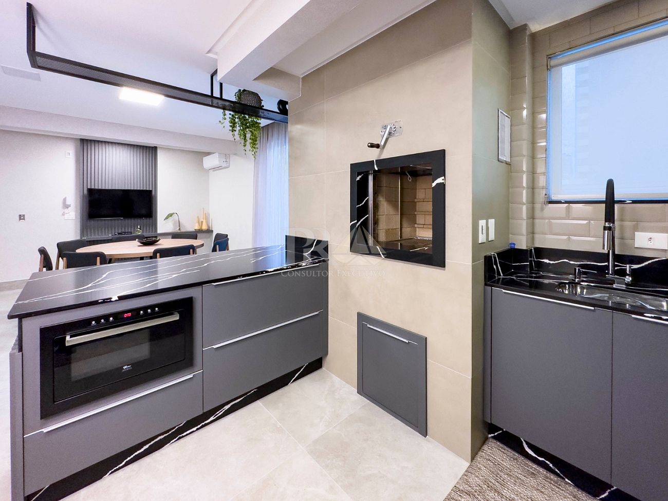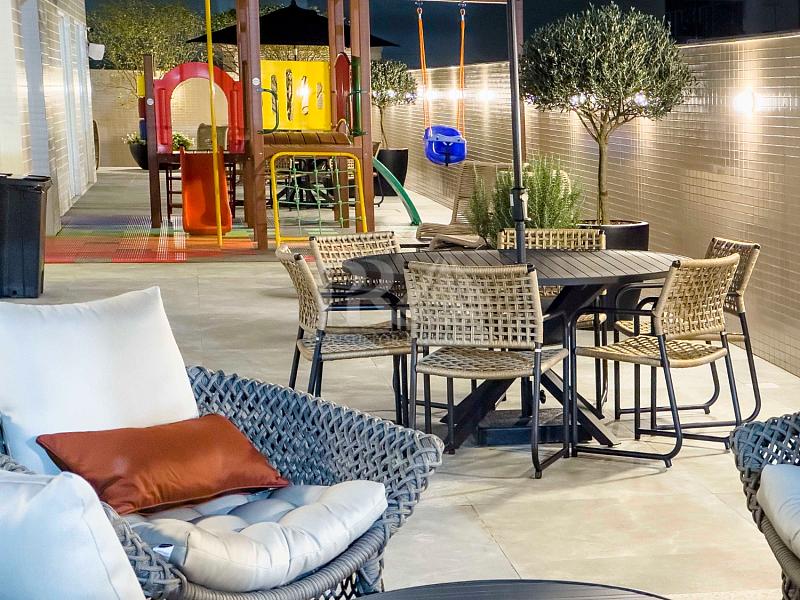 A churrasqueira agrega um toque especial para quem aprecia reunir amigos e família. As venezianas manuais oferecem controle de iluminação e contribuem para um ambiente mais acolhedor.