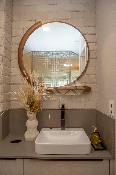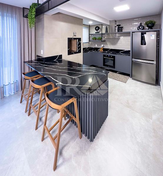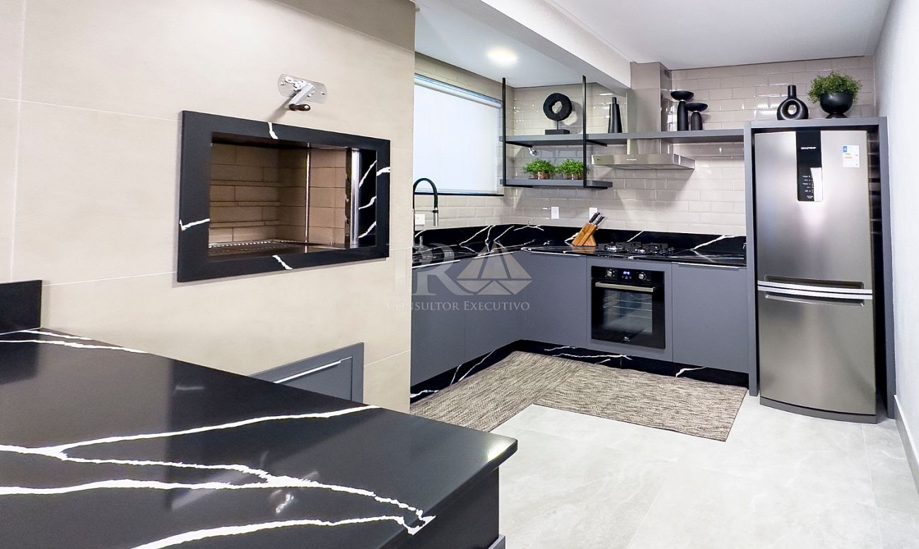 A cozinha, prática e bem equipada, vem acompanhada de uma área de serviço funcional. O imóvel conta ainda com lavabo, closet e dormitórios que garantem privacidade e conforto. O acabamento em porcelanato reforça a modernidade do projeto, enquanto a infraestrutura para TV, internet e telefone assegura praticidade no dia a dia.